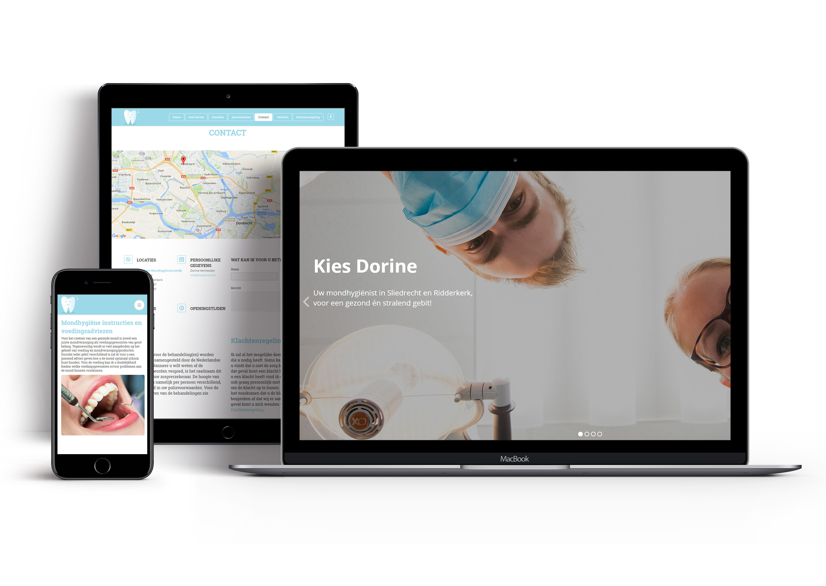 Voor een mondhygiëniste is de website erg belangrijk aangezien veel potentiële klanten eerst op de website zullen kijken voordat zij beslissen een afspraak te maken. De website heeft de juiste uitstraling nodig om toekomstige klanten aan te spreken. Voor Dorine is een vriendelijke en open uitstraling belangrijk, maar ook een stukje professionaliteit mag niet ontbreken. Het maken van eigen foto’s heeft ons de mogelijkheid gegeven om ook daarin de juiste uitstraling en boodschap te vangen. Het resultaat zorgt voor een professioneel ogende doch toegankelijke uitstraling.